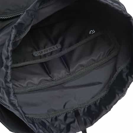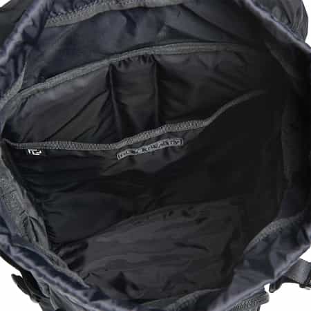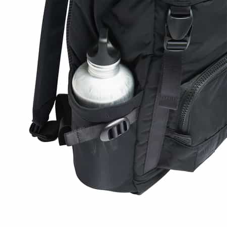 サイドにはスロットとメッシュのボトルポケット、両サイドに容量調節ストラップを備えています。
