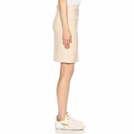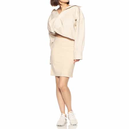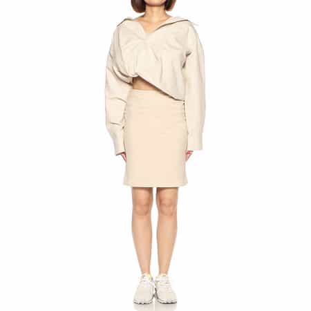・シンプルなタイトミニスカート・ソリッドのウール素材・2022年春夏シーズン プレコレクション・サイモン・ジャックムスが手掛けるフランスのファッションブランド<JACQUEMUS(ジャックムス)>。独学で服作りを習得し、2009年に小さなアトリエを構えて自身のコレクション制作をスタート。アンダーグラウンドやポップカルチャーの影響を受けつつも、ミニマルで洗練されたアイテムを展開。モダンなカッティングやシルエットが特徴的なブランドです。モデル:H169 B78 W58 H81 着用サイズ 34