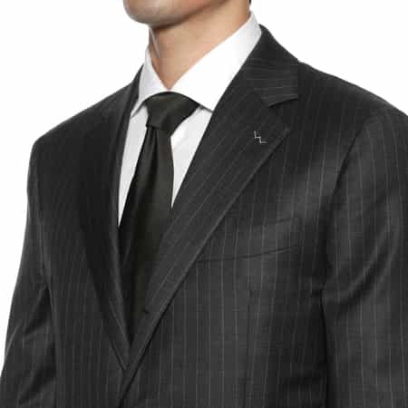・肩や胸周りは必要最小限の毛芯で、ごく軽やかに構築したスーツ