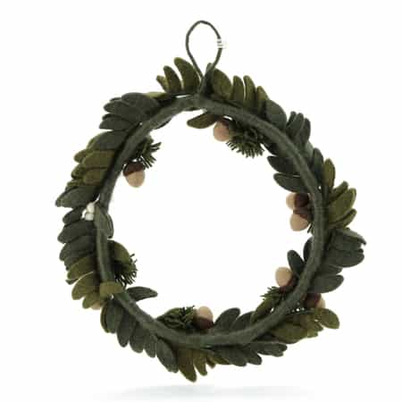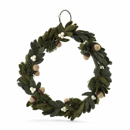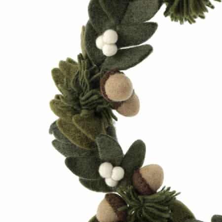 ・濃淡のあるグリーンの葉と白い実やどんぐりをあしらったフェルトリース