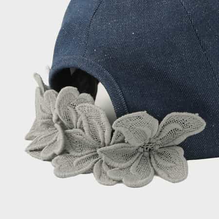 ・岡山県産のデニム生地の帽子本体にフラワーモチーフのレース